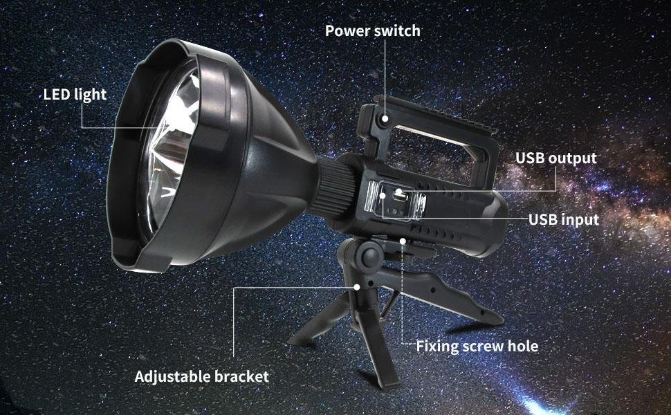 The rechargeable spotlight flashlights can be recharged repeatedly. It has a built-in 8000mAh large-capacity lithium battery and is equipped with a USB output port. It is like a power bank, which can quickly and conveniently charge your device. It is also a good companion for you to go out.It also has a battery indicator.